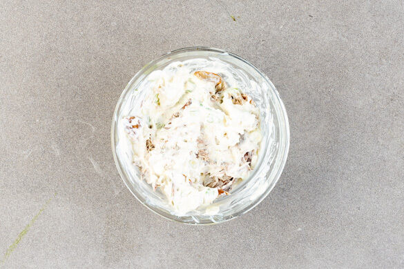 Die Makrele mit einem scharfen Messer von der Haut befreien und in kleine Stücke zupfen oder schneiden, dabei evtl. größere Gräten entfernen. Unter die Creme mengen und die Füllung mit Salz und Pfeffer abschmecken.