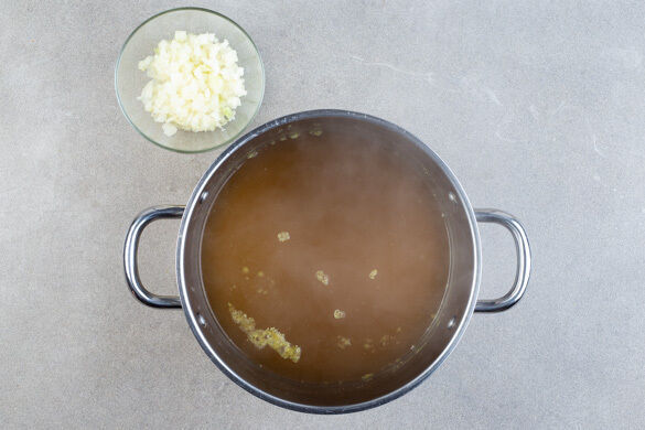 In einem kleinen Topf 500ml Wasser mit der ½ des Brühgewürzes zum Kochen bringen. Die Zwiebel schälen, halbieren und fein würfeln.