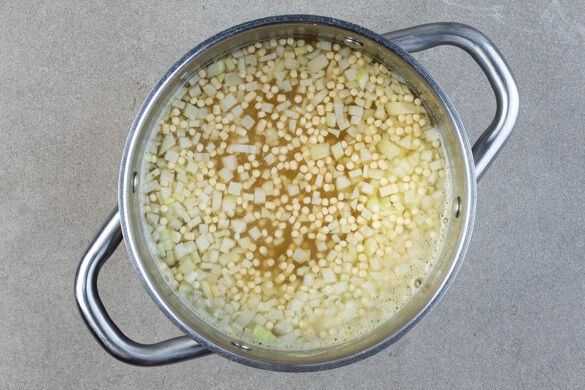 Den Perlencouscous und die Zwiebeln in die kochende Brühe geben und 6–7Min. kochen lassen.