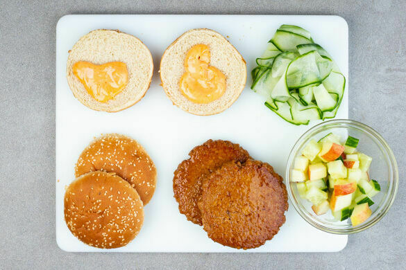 Veggie-Burger mit Ahornsirupglasur dazu Röstkartoffeln und Apfel-Gurken-Salat