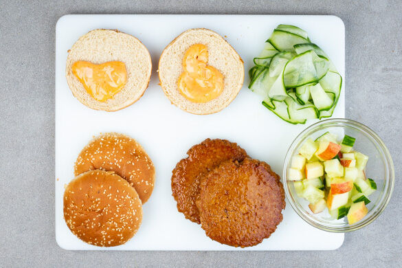 Heute gibt’s Burgergenuss auf hohem Niveau: Die saftigen Pattys werden in einer würzig-süßen Ahornsirupglasur gebraten, ehe sie mit eingelegten Gurkenstreifen, pikantem Sriracha-Dip und knackigem Salat mit frisch-fruchtigem Apfel und würzigem Sellerie das Burgerbrötchen zieren. Der Salat fungiert übrigens – schick mit Erdnüssen bestreut – neben knusprigen Ofenkartoffeln auch noch zusätzlich als Beilage. Lass es dir schmecken!