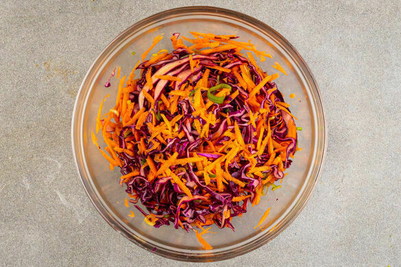 Die Karotten ggf. schälen, den Rotkohl halbieren und beides grob raspeln. Die Lauchzwiebeln in feine Ringe schneiden. Die Limettenschale abreiben, dann die Limette auspressen. Die Karotten, den Rotkohl, die grünen Lauchzwiebeln, 1EL Limettensaft, 2EL Olivenöl, 2EL Essig und 1 kräftigen Prise Salz vermengen, dann mit Salz und Pfeffer abschmecken.