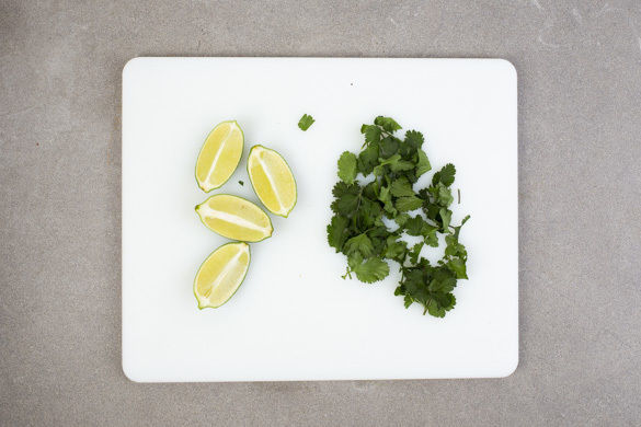Die Korianderblätter von den Stängeln zupfen und grob schneiden. Die Limette in Spalten schneiden. Die Steaks mit dem Reis und dem Bohnengemüse anrichten. Mit dem Koriander und den Limettenspalten garniert servieren.