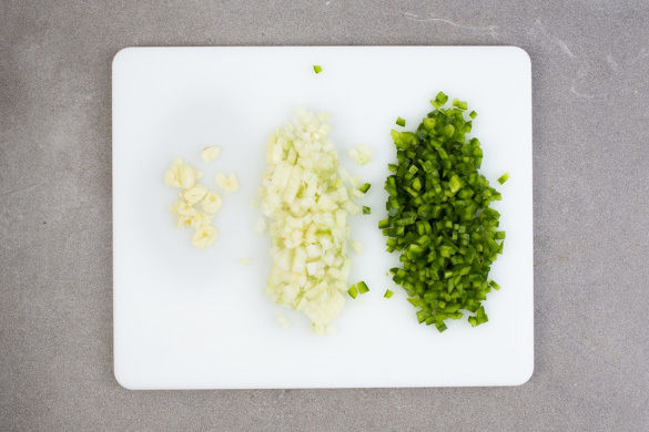 Die Paprika vierteln, entkernen und in ca. 0,5cm kleine Würfel schneiden. Die Zwiebel schälen, halbieren und in feine Würfel schneiden. Den Knoblauch schälen und ebenfalls fein würfeln.