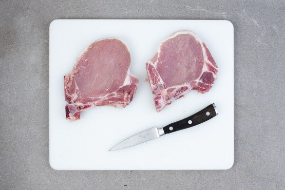 Das Fleisch mit etwas Küchenkrepp trocken tupfen. Die Sehne unter dem Fettrand mit einem scharfen Messer minimal einschneiden, so wird verhindert, dass sich das Fleisch beim Braten zusammenzieht und dadurch nicht gleichmäßig gart.