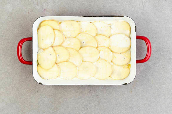 Eine große Auflaufform mit 1EL Butter fetten. Die Kartoffelscheiben abwechselnd mit der Sardellenmischung dachziegelartig einschichten und leicht andrücken. Die Sahne mit 100ml Wasser verrühren, mit Salz und Pfeffer würzen und gleichmäßig über den Auflauf gießen. Im Ofen in ca. 30Min. goldgelb backen.