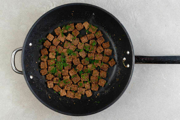 In der Pfanne 2EL Butter schmelzen lassen. Das Brot darin bei mittlerer Hitze 4–5Min. knusprig anrösten, mit Salz und Pfeffer würzen. Den Dill untermengen und die Croûtons auf dem fertigen Auflauf verteilen. Den Roten Blattsenf mit dem Dressing vermengen und zum Kartoffelauflauf servieren.