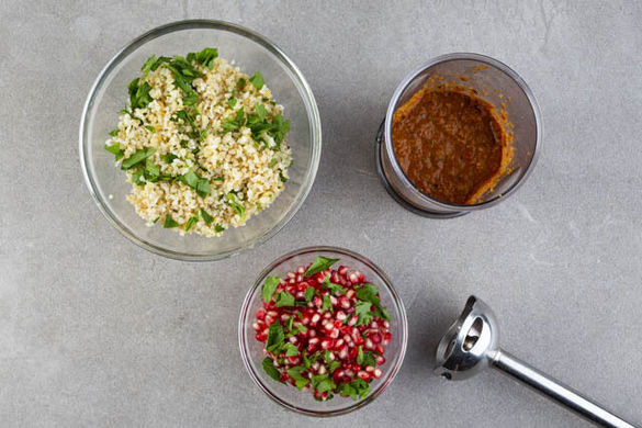 Die Paprika die Mandeln, die Balsamicocreme, 3EL Wasser und 1/2TL Salz in einem hohen Gefäß pürieren. Die Petersilie samt Stängeln grob hacken. Die 1/2 der Petersilie unter den Bulgur mengen, die restliche Petersilie mit den Granatapfelkernen mischen. Die Tajine mit dem Bulgur anrichten, mit dem Dip und Granatapfel garnieren und servieren.