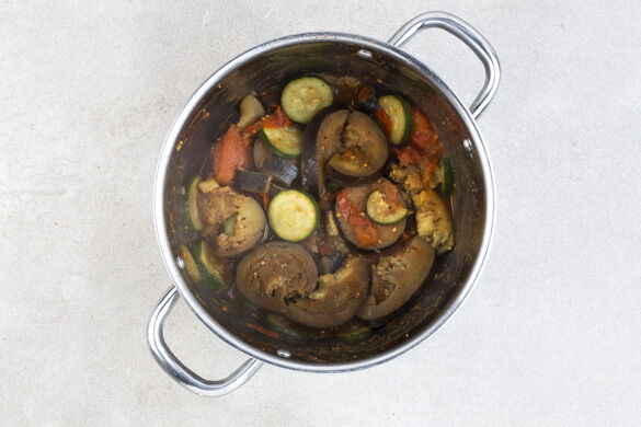 In einem mittelgroßen Topf 1TL Olivenöl stark erhitzen. Die Auberginen, die Tomaten und die Zucchini in den Topf schichten, dabei jede Lage mit etwas Pfeffer, Tajine- und Brühgewürz bestreuen. 100ml Wasser angießen und das Gemüse abgedeckt 12–15Min. bei mittlerer Hitze unter gelegentlichem Rühren schmoren. Mit Salz und Pfeffer abschmecken.