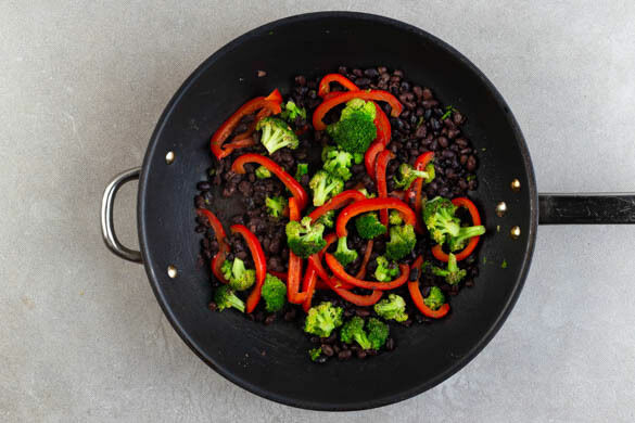 Den Brokkoli und die Paprika in einer großen Pfanne mit 2EL Olivenöl bei mittlerer bis starker Hitze ca. 5Min. anbraten, dann die Bohnen mit 4EL Wasser hinzufügen und 3–4Min. mitkochen, bis der Brokkoli gar ist. Das Gemüse mit der Limettenschale, Salz und Pfeffer abschmecken.