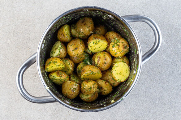 Die Kartoffeln samt Schale halbieren und in einem mittelgroßen Topf mit leicht gesalzenem Wasser bedecken. Bei starker Hitze zum Kochen bringen, dann abgedeckt bei niedriger bis mittlerer Hitze 15–20Min. kochen, bis die Kartoffeln gar sind.
