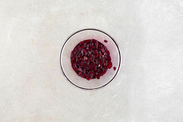 4EL hellen Essig mit 1TL Zucker und 1 kräftigen Prise Salz verrühren. Die Rote Bete schälen, in kleine Würfel schneiden und mit dem Essig vermengen. Bis zum Servieren beiseitestellen. Tipp: Da Rote Bete stark färbt, beim Verarbeiten am besten Küchenhandschuhe und Schürze tragen.