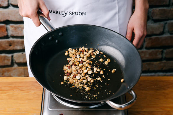 Die Haselnüsse grob hacken und in einer großen Pfanne ohne Öl auf niedriger bis mittlerer Hitze ca. 1-2Min. leicht rösten. Vorsicht! Die Haselnüsse können schnell anbrennen. Die Haselnüsse dann aus der Pfanne nehmen, die Pfanne aufheben.