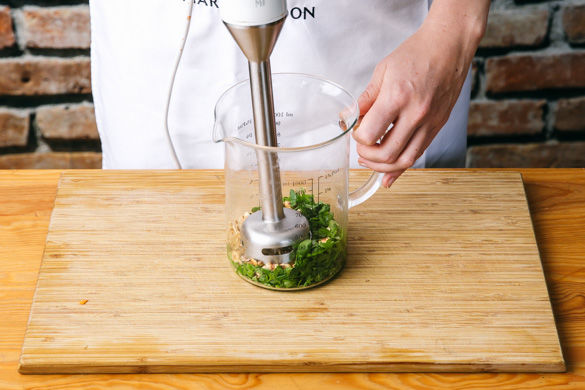 Nun die Knoblauchzehe schälen und vierteln. Den Rosmarin und Zitronenthymian vom Stängel streifen und mit Petersilie samt Stängel grob hacken. 1/2 der Nüsse mit Dressing, Knoblauch und den gehackten Kräuter mit einem Stabmixer cremig pürieren, ggfs. etwas Wasser hinzufügen. Tipp: Wer mag, kann auch nur die halbe Knoblauchzehe verwenden!