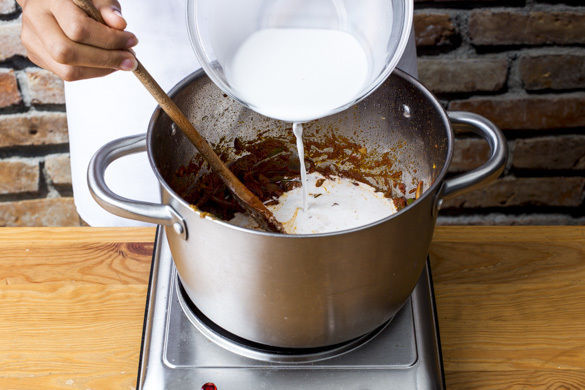 Die Paprika, die Zwiebeln und den Knoblauch in einem großen Topf mit 1EL Pflanzenöl bei mittlerer Hitze 1–2Min. anbraten. Die Currypaste nach Geschmack und das Tomatenmark unterrühren und mit der Kokosmilch und 50ml Wasser ablöschen. Das Curry 7–8Min. sanft köcheln lassen.