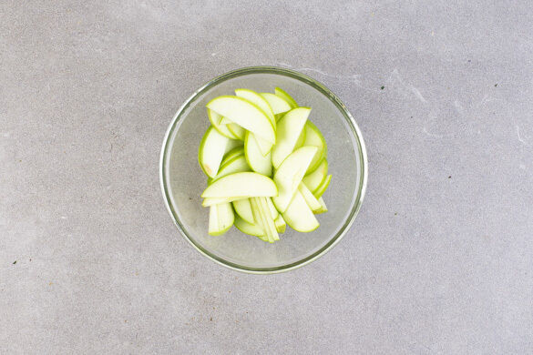 Die Zitrone auspressen. Den Apfel vierteln, entkernen, in dünne Scheiben schneiden und mit 1–2EL Zitronensaft vermengen.