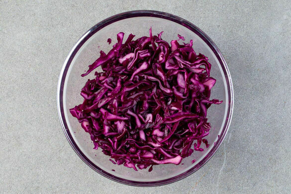 Den Backofen auf 240°C (220°C Umluft) vorheizen. Die Rotkohlstreifen mit der 1/2 der Gewürzmischung, 2EL Essig und je 1/2TL Salz und Zucker vermengen und mit den Händen 2–3Min. durchkneten, bis der Kohl weich wird. Tipp: Dabei am besten Küchenhandschuhe tragen, da der Rotkohl stark färbt.