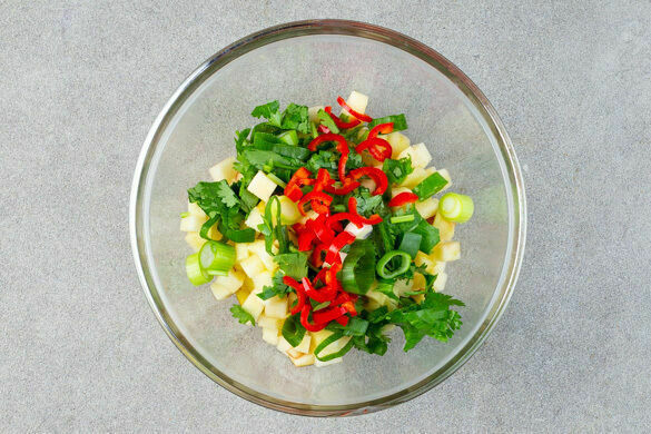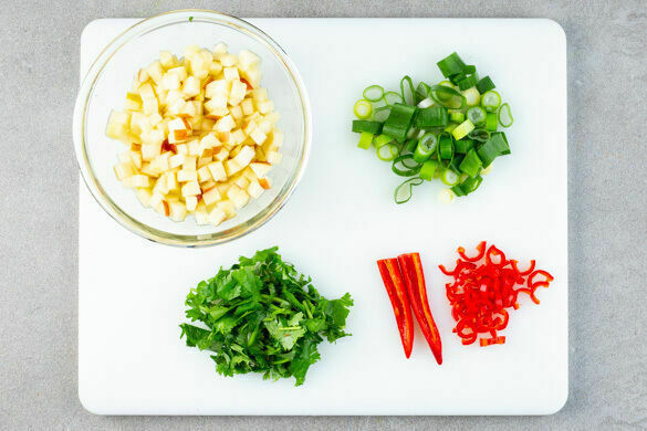 Die Äpfel vierteln, entkernen und in ca. 0,5cm große Würfel schneiden. Die Lauchzwiebeln in Ringe schneiden. Den Koriander samt Stängeln grob schneiden. Die Peperoni längs halbieren und in feine Streifen schneiden. Tipp: Für weniger Schärfe die Kerne entfernen.