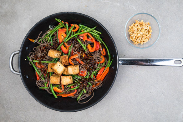 Es gibt Gerichte, die sind so lecker und dabei so schnell zubereitet, dass man es kaum glauben mag! Zu knusprig gebratenem Tofu und knackigem Gemüse passen perfekt die feinen Sobanudeln mit ihrer würzigen Sauce. Mit Schwarzer Bohnen- und Sojasauce steckt sie voll köstlicher Aromen. Geröstete Erdnüsse steuern eine Extraportion Crunch bei. Lasst es euch schmecken!