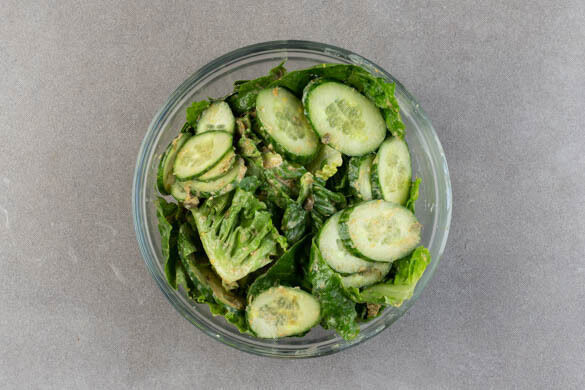 Die Pilze und die restlichen Hefeflocken mit 2EL Pflanzenöl und einer kräftigen Prise Salz in einer großen Pfanne bei mittlerer bis starker Hitze 5–7Min. anbraten, bis die Pilze weich und appetitlich gebräunt sind. Inzwischen die Gurke in dünne Scheiben schneiden. Den Romanasalat in mundgerechte Stücke zupfen.