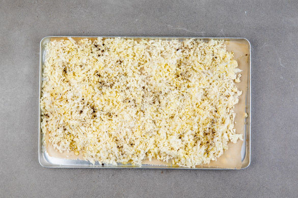 Den Backofen auf 220°C (200°C Umluft) vorheizen. Die Zwiebeln schälen, halbieren und in feine Würfel schneiden. Den Knoblauch schälen und ebenfalls fein würfeln.