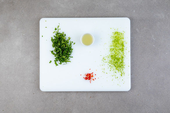 Die Limettenschale abreiben, dann die Limetten halbieren und auspressen. Die Chilischote längs halbieren, ggf. für weniger Schärfe entkernen und in möglichst feine Streifen schneiden. Den Koriander samt Stängeln fein schneiden.