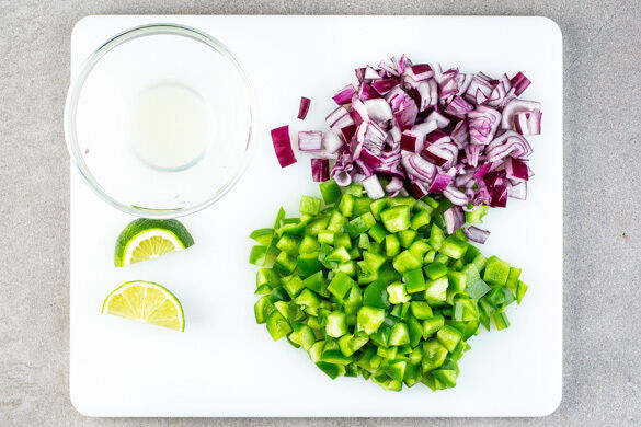 Die Zwiebel schälen, halbieren und in ca. 1cm große Würfel schneiden. Die Paprika vierteln, entkernen und ebenfalls in ca. 1cm große Würfel schneiden. Die Limette halbieren und eine Hälfte auspressen, die andere Hälfte in Spalten schneiden.