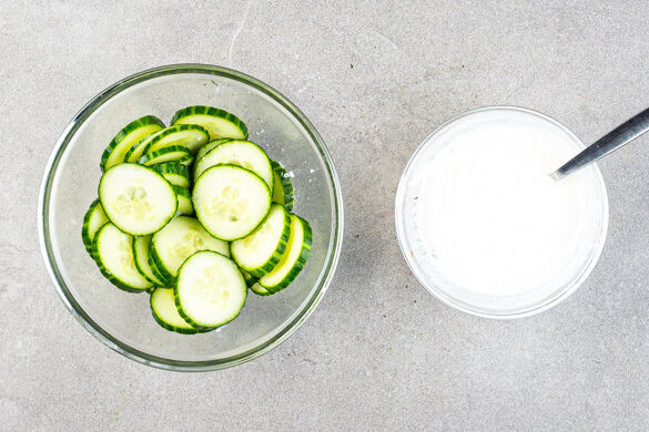 Die Crème fraîche mit 1EL Limettensaft verrühren und mit Salz und Pfeffer abschmecken. Die Gurke in dünne Scheiben schneiden und mit dem restlichen Limettensaft sowie 1 Prise Salz vermengen. Ggf. etwas hellen Essig hinzufügen.
