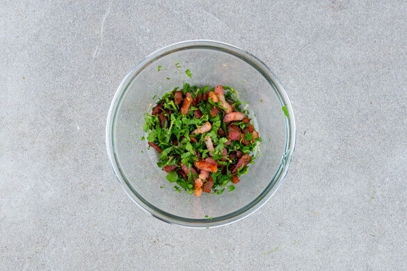 Die Paprika, die Schalotten, Peperoni nach Geschmack und die Petersilienstängel in der Pfanne mit 1EL Olivenöl bei mittlerer Hitze ca. 1min. anbraten. Dann den restlichen Speck, die Kirschtomaten, den Knoblauch und ca. ⅔ der Petersilienblätter mit einem Schuss Kochwasser hinzugeben und 4–5Min. garen, bis das Gemüse gar ist.