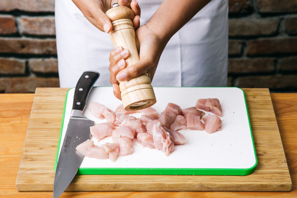 Die Hähnchenbrust in ca. 2cm große Würfel schneiden und mit Salz und Pfeffer würzen