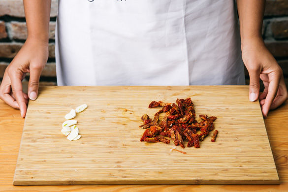 Die getrockneten Tomaten abtropfen lassen und in feine Streifen schneiden. Den Knoblauch schälen und in feine Scheiben schneiden.