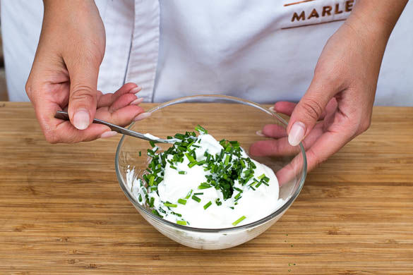 Den Schnittlauch fein hacken und mit dem Frischkäse und ggf. etwas Wasser cremig verrühren. Mit Salz und Pfeffer abschmecken.