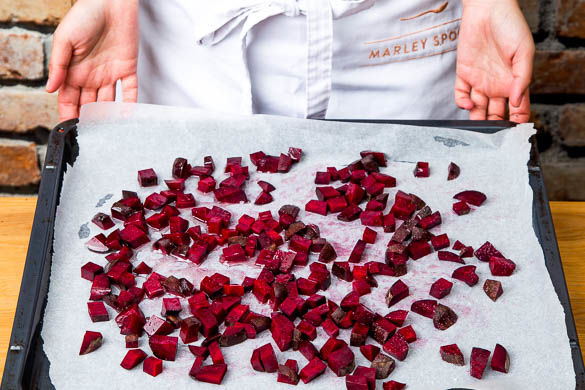 Den Backofen auf 200°C Umluft oder 220°C Ober-/Unterhitze vorheizen. Die Rote Bete schälen und in 1–2cm große Stücke schneiden. Tipp: Da Rote Bete stark färbt, am besten mit Handschuhen und Schürze arbeiten. Die Rote Bete auf einem mit Backpapier belegten Backblech mit etwas Olivenöl und Salz vermengen, dann verteilen und im Ofen ca. 20Min. garen.