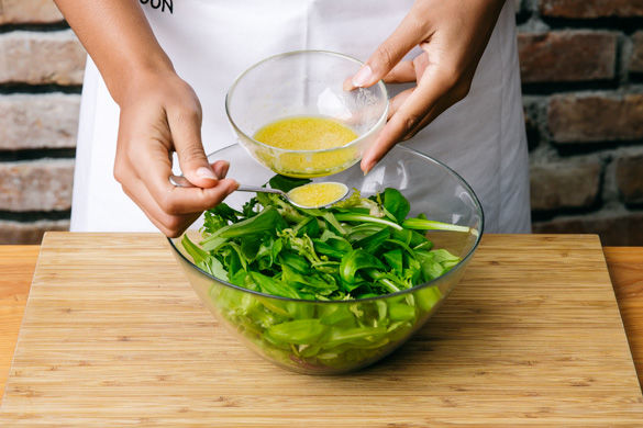 Aus 1-2EL Olivenöl, 1-2EL Essig, dem Senf und etwas Salz und Pfeffer eine Vinaigrette rühren und vorsichtig mit dem Salat vermischen.