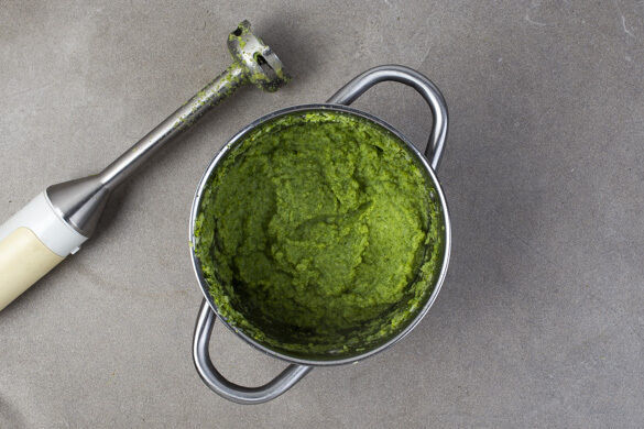 Den Brokkoli in mundgerechte Röschen, den Strunk in dünne Scheiben schneiden. Ins kochende Wasser geben und abgedeckt in 8–10Min. bissfest kochen. Ca. 1 Tasse Kochwasser abschöpfen, dann den fertigen Brokkoli in ein Sieb abgießen und abtropfen lassen. Die Orange halbieren, eine Hälfte in dünne Scheiben schneiden, die andere Hälfte auspressen.