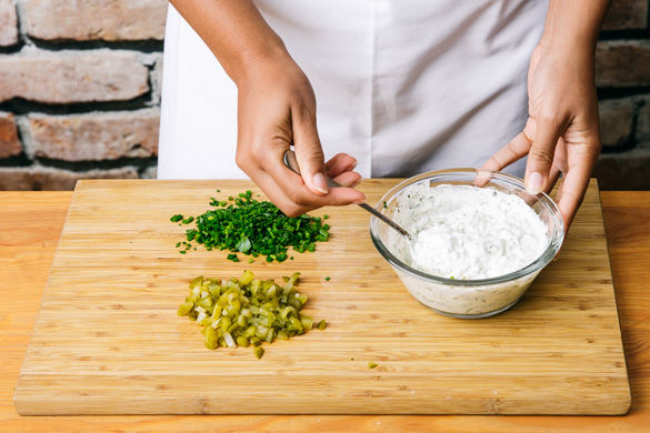 Die Petersilie samt Stängel und den Schnittlauch fein hacken und die Hälfte mit dem Joghurt mischen. Die Gurke in kleine Würfel schneiden und dazu geben. Alles mit Salz und Pfeffer abschmecken.
