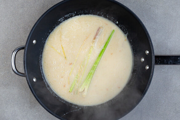 Das Zitronengras halbieren und mit einem Nudelholz oder einer schweren Pfanne flach klopfen. Die Lauchzwiebeln in feine Ringe schneiden.