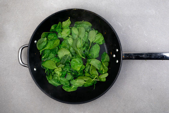 Den Spinat in derselben Pfanne 5–8Min. anbraten, bis er zusammengefallen ist. Ggf. etwas Wasser hinzugeben. Den Spinat anschließend in einer Schüssel mit dem restlichen Sesamöl vermengen. Die Pfanne aufbewahren.