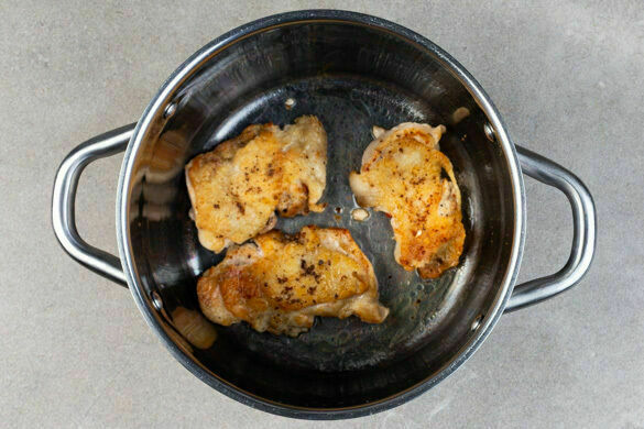 Das Fleisch trocken tupfen und rundum mit 1 kräftigen Prise Salz würzen. Dann in einem großen Topf mit 3EL Olivenöl bei mittlerer bis starker Hitze auf jeder Seite ca. 2Min. leicht anbräunen, aber noch nicht durchbraten. Aus dem Topf nehmen und auf einem Teller beiseitestellen.