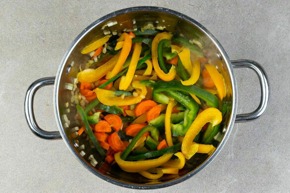 Die Zwiebeln, die Karotten und die Paprika in den Topf geben und bei mittlerer bis starker Hitze ca. 3Min. braten.