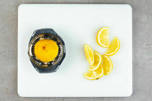 Die Zitrone halbieren und eine Hälfte in Spalten schneiden, die andere Hälfte auspressen.