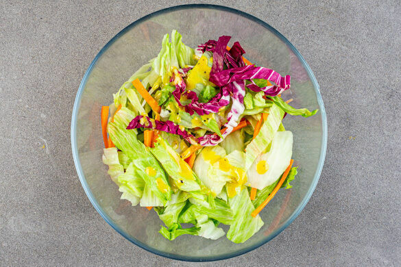Den restlichen Zitronensaft mit 2EL Olivenöl, 2TL Senf sowie je 1 kräftigen Prise Salz und Pfeffer zu einem Dressing verrühren. Das Dressing mit der Salatmischung vermengen.
