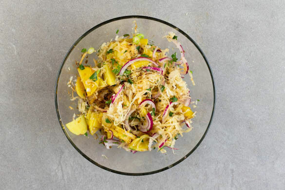 Inzwischen die Zwiebeln schälen, halbieren und in feine Streifen schneiden. Die Lauchzwiebeln in feine Ringe schneiden. Die Petersilie samt Stängeln fein schneiden. Das Sauerkraut mit den Händen auspressen.