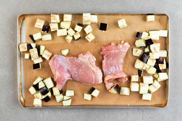Die Auberginenwürfel und das Fleisch auf einem mit Backpapier ausgelegten Backblech mit 2EL Olivenöl und 1 kräftigen Prise Salz einreiben. Im Ofen 10–14Min. rösten, bis das Gemüse rundum goldbraun und das Fleisch gar ist, dabei zur Hälfte der Zeit einmal wenden. Den Knoblauch schälen und fein würfeln oder durch eine Knoblauchpresse drücken.