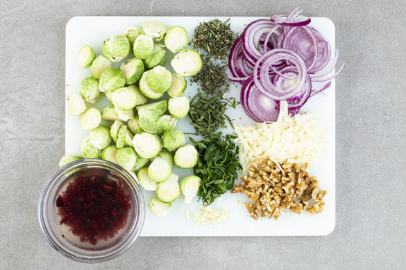 Die Cranberrys grob hacken und in warmem Wasser einweichen. Die ½ des Rosenkohls halbieren. Der übrige Rosenkohl wird für dieses Rezept nicht benötigt. Die Kräuter abzupfen und separat fein hacken. Den Knoblauch schälen und fein würfeln. Die Zwiebel schälen und in sehr feine Ringe schneiden. Die Walnüsse grob hacken. Den Käse grob reiben.