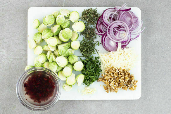 Die Cranberrys grob hacken und in warmem Wasser einweichen. Den Rosenkohl halbieren. Die Kräuter abzupfen und separat fein hacken. Den Knoblauch schälen und fein würfeln. Die Zwiebeln schälen und in sehr feine Ringe schneiden. Die Walnüsse grob hacken. Den Käse grob reiben.