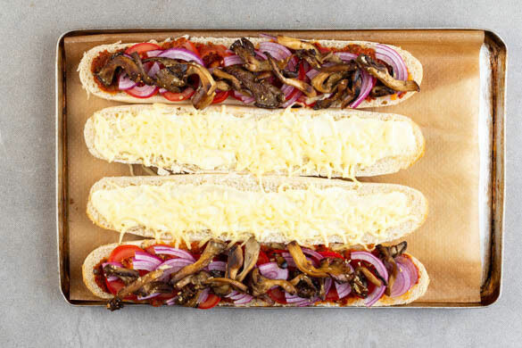 Die Brötchen aufschneiden und mit der Schnittfläche nach oben auf ein mit Backpapier ausgelegtes Backblech geben. Die unteren Brötchenhälften mit dem Pesto bestreichen, dann mit den Tomaten, den Zwiebeln und den Pilzen belegen. Die oberen Hälften mit je ½EL Mayonnaise bestreichen und mit dem Käse belegen. Im Ofen ca. 5Min. backen, bis der Käse geschmolzen ist.