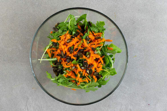 2EL Olivenöl, 1EL Essig und je 1 Prise Salz und Pfeffer verrühren. Den Rucola, die Karottenraspel und die Kürbiskerne mit dem Dressing vermengen.
