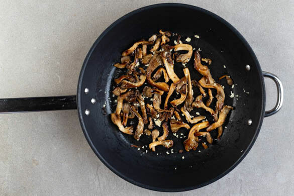 Den Knoblauch schälen, fein würfeln und zu den Pilzen in die Pfanne geben. Mit je ½TL Salz und Pfeffer würzen und ca. 1Min. mitbraten, dann die Pfanne vom Herd nehmen.
