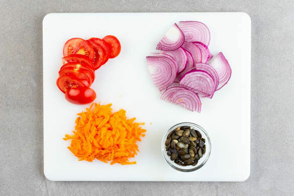 Die Kürbiskerne in einer kleinen Pfanne ohne Zugabe von Fett bei mittlerer Hitze 2–4Min. anrösten, bis sie knistern und goldbraun sind. Zum Abkühlen aus der Pfanne nehmen. Die Tomaten in dünne Scheiben schneiden. Die Zwiebel schälen, halbieren und in feine Streifen schneiden. Die Karotten ggf. schälen und grob raspeln.